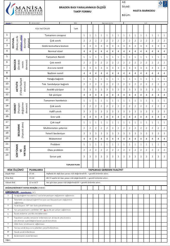 12. HASTALARIMIZIN ILK YATIŞLARINDA; İTAKI VE BRADEN SKALALARI KULLANILARAK DÜŞME RISKI DEĞERLENDIRMESI, BRADEN BASINÇ YARALANMASI SKALASI KULLANILARAK BASINÇ YARASI RISKI, NRS 2002 SKALASI KULLANILARAK NUTRISYONEL (BESLENME) DESTEK IHTIYAÇLARI BELIRLENEREK TEDAVI SÜRECINE HEMŞIRELIK KATILIMININ NITELIĞI KAYIT ALTINA ALINMIŞ OLMAKTADIR.