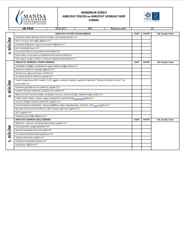 14. CERRAHI KLINIKLERIMIZDE SAĞLIK BAKANLIĞININ YAYINLAMIŞ OLDUĞU AMELIYAT ÖNCESI VE SONRASI HEMŞIRELIK SÜRECINE UYGUN OLARAK FORM TASARLANMIŞ, AMELIYAT SÜRECININ 5 AYRI DÖNEMI KONTROL ALTINA ALINMAKTADIR.