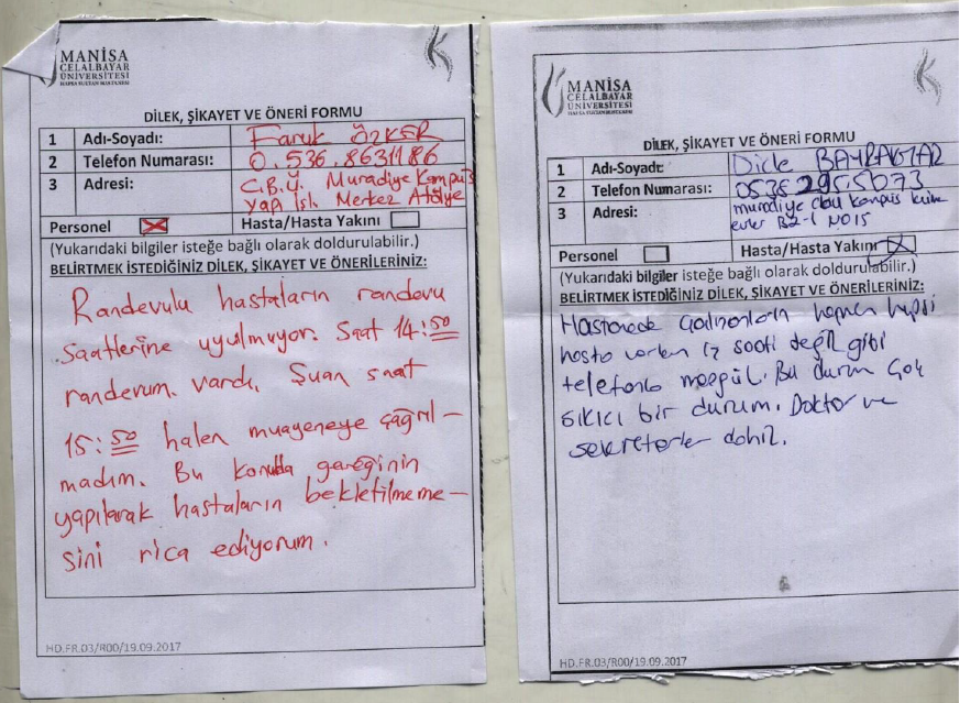 6. HASTANE IÇERISINDE 15 AYRI NOKTADA ŞIKAYET/ÖNERI KUTULARI KONUMLANDIRILMIŞTIR. BU ALANLARDA YAPILAN BILDIRIM DEĞERLENDIRMELERI AYLIK PERIYOTLARDA ÖNERI/ŞIKÂYET EKIBI TARAFINDAN DEĞERLENDIRILMEKTE IYILEŞTIRME ÇALIŞMALARI DÜZENLENMEKTEDIR. İLETIŞIM BILGILERI BULUNAN BILDIRIMLERE ILIŞKIN MESAJ YOLU ILE DÖNÜŞ YAPILMAKTADIR.